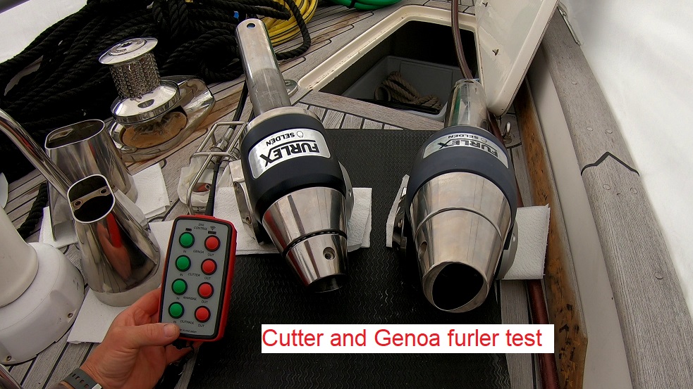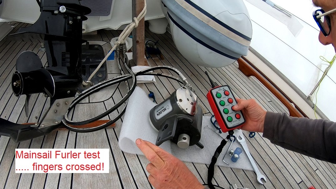 First thing after breakfast, I’m crawling forward on side deck to test the furling motors that I had set up last night. I thought I might have nightmares about them not working or blowing up, but I didn’t. I slept well, thank you. Though I have to say, I’m a tag nervous as I first press the button to activate the mast furler.
